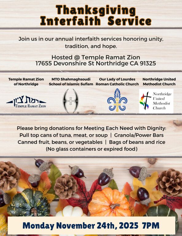 This year, our annual Thanksgiving Interfaith Prayer Service will take place at Temple Ramat Zion. Come join our Catholic, Methodist, Jewish, and Muslim brothers and sisters for prayer in unity, tradition, and hope. Please bring non-perishable food items to support M.E.N.D. (Meet Each Need With Dignity).